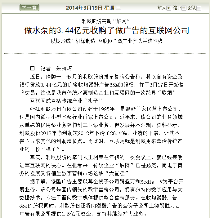 2014年利歐泵業發布復牌公告稱,將以自有資金及銀行貸款3.44億元的價格收購漫酷廣告85%的股權,并于3月17日開始復牌交易。這也是我市傳統水泵制造企業和互聯網的一次跨界“聯姻”。下面是當時的報紙報道: