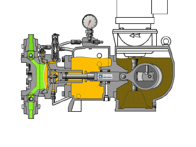 隔膜泵的缸蓋主要由隔膜隔開,以將待輸送的液體與工作流體分開。當隔膜移動到傳動機構的一側時,泵缸中的工作室會在負壓下抽吸液體。當隔膜移動到另一側時,然后排出液體。待輸送的液體通過泵缸中的隔膜與工作流體分離,并且僅與泵缸,吸入閥,排放閥和隔膜的內側接觸,而沒有與柱塞和密封裝置接觸,因此重要部件例如塞子完全在含油介質中工作,并且可以處于良好的工作狀態。下圖顯示了隔膜泵的工作狀態。